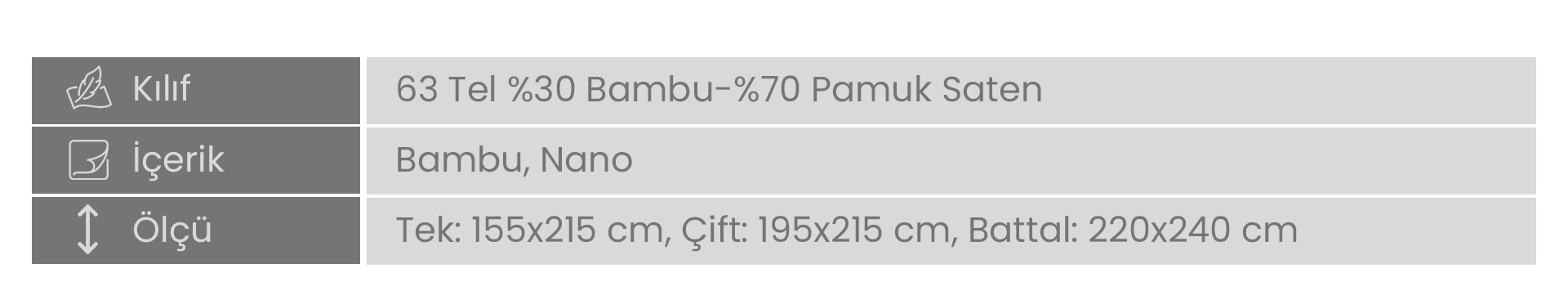 İç Dolgu: %30 Bambu + %70 Nano Dolgu (300 gr/m² yoğunluk)